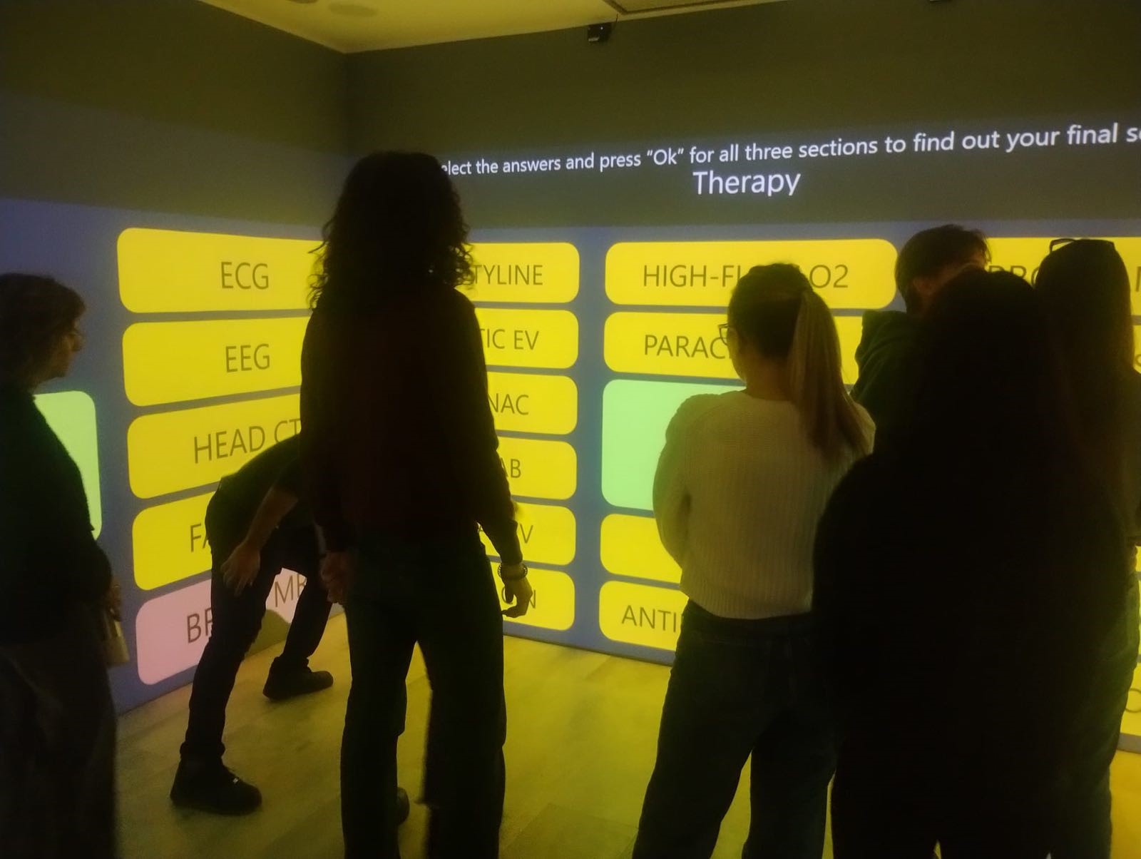 Nella Camera immersiva, ultima tappa del percorso formativo, il corso diventa un game: sulle pareti vengono proiettate tre caselle interattive. A seconda di quella scelta, il corsista inizia a trattare un paziente più o meno grave, stimolato dalle opzioni possibili che compaiono sulle pareti della stanza. Fra queste, video o audio interviste ai “pazienti simulati” aiutano nell’anamnesi e immagini diagnostiche (tac, encefalogramma e liquor), anche queste proiettate, conducono i corsisti a prendere decisioni e arrivare a una diagnosi. Al termine del percorso si ottiene un punteggio. Se questo non è sufficiente si ripete il percorso, con l’ovvio vantaggio di poter tentare soluzioni senza mettere a rischio l’esito delle cure su un paziente vero.